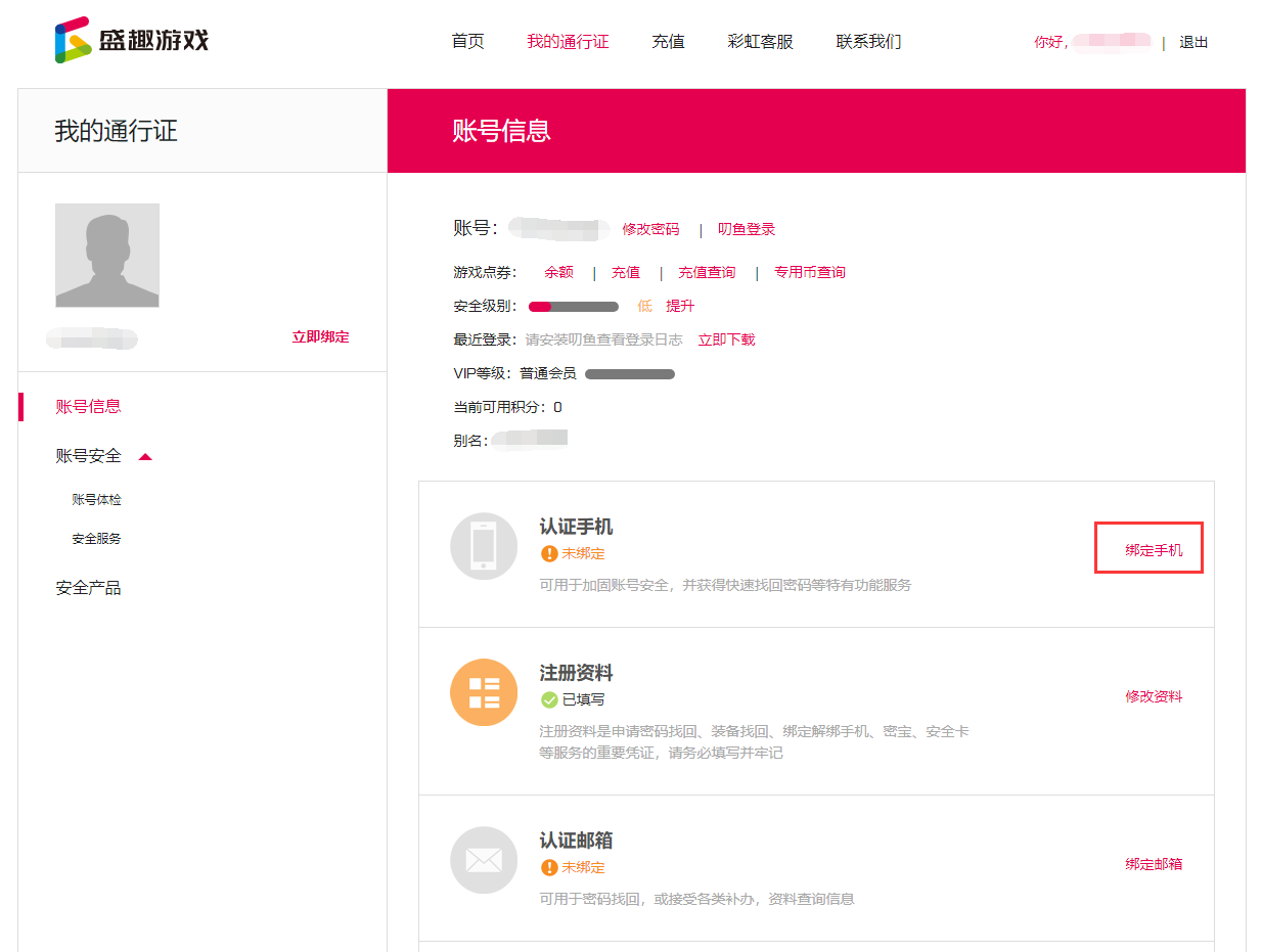 1、进入“我的通行证>>”页面,登录您欲进行手机绑定的盛趣通行证账号,点击“绑定手机”