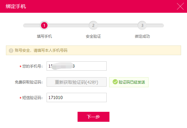 2、填写您欲绑定的手机号,点击发送“免费获取验证码”