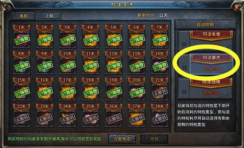 今天我们不按部就班,着重提高一下效率,谈谈如何快速入门、快速升级,暂时先不跟剧情走,因为任意模式都不会影响升级。首先我们先点击左上角的玛法特权,想快速升级的小伙伴可以选择“玛法豪杰”这种月卡(适合6职业),此月卡非常适合新人玩家,里面分别有: