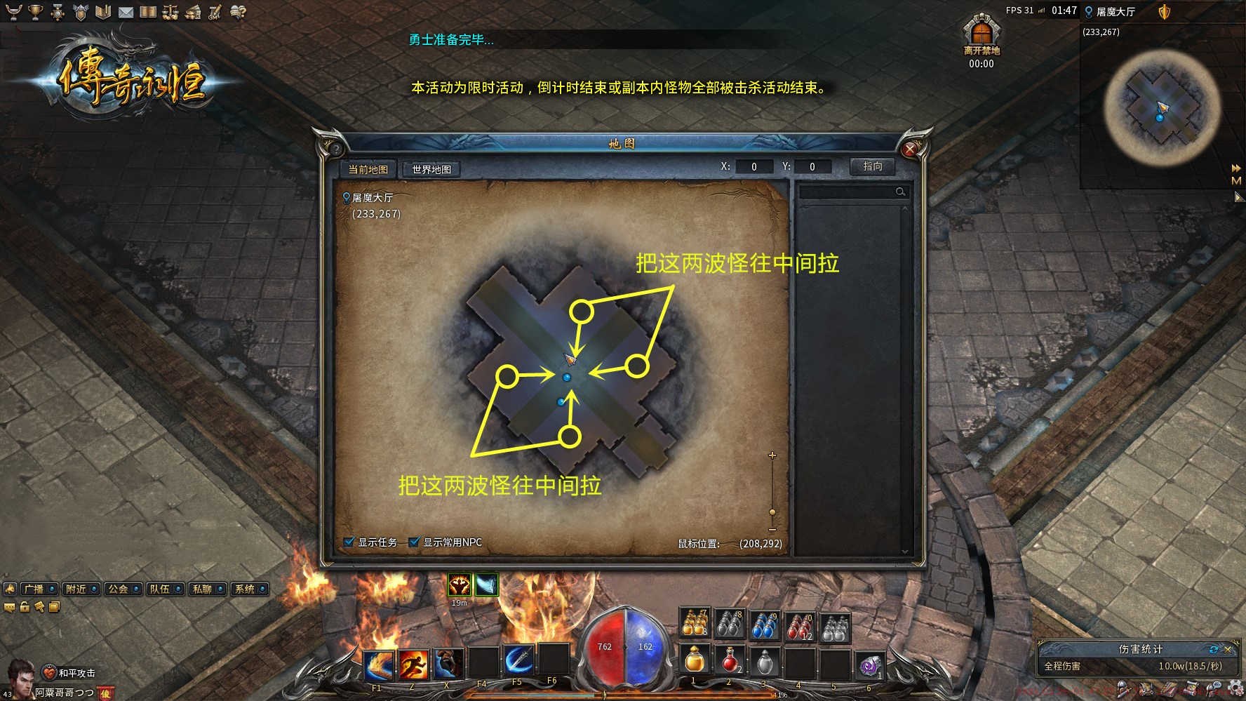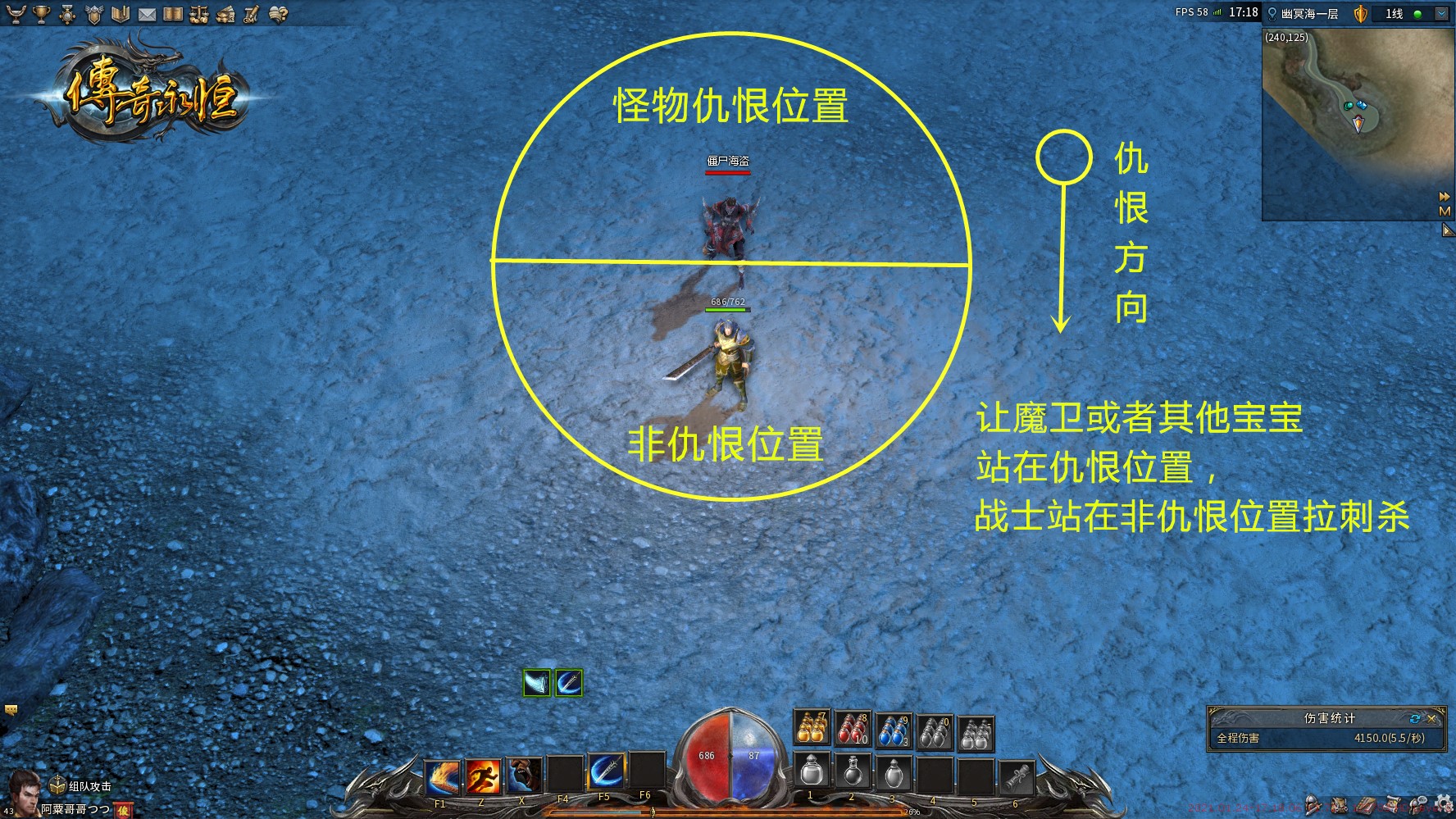 一切准确妥当我们直接飞盟重的码头,找NPC“神秘法师”坐标(575,770),先接取“寻找虎卫”的任务,建议优先使用灵符进入“幽冥海”(【魔龙版本】之前都可以使用灵符进入幽冥海),别忘了和海里面的NPC对话,接取任务击杀指定数量的怪,就能完成任务。使用魔卫拉怪,所有的玩家站到非仇恨位置攻击怪物,以此减少不必要的消耗,如何看怪物仇恨位置详见下图。