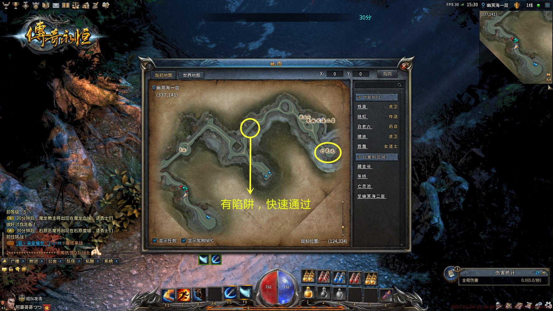 如果不想打宝了,当达到30级后就可以接石墓紧急任务了,也能获得不少的经验值,我们直接从盟重进入坐标(424,532)石墓地图,按M键打开地图,在地图上面会发现有“蓝色小恶魔头像”的地方,走到附近便会自动接取紧急任务,打指定数量的怪便会完成当前的紧急任务,每一层都有1个或者多个紧急任务点,一天可以做五个,经验可观且非常容易获取。