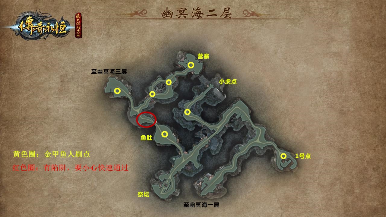 “幽冥海”二层可以去1号点或者去其他刷金甲的点守精英怪。金甲鱼人的打法:发现“金甲鱼人”精英后,先要将周围的其他怪物杀掉,清理出一块空地,道士无限召宝宝,上毒贴符,金甲身边会刷很多原地自爆的“鱼人死士”其他职业要拉开距离击杀,击杀后有机率出任务物品“鱼人法器”,(完成“幽冥海”二层任务“寻找虎卫”后可以获得一把沃玛级别的武器)。不出意外的话,这一趟“幽冥海”之旅每个队友身上的海装应该还是可以装备起来的,运气好还能出几件沃玛件。