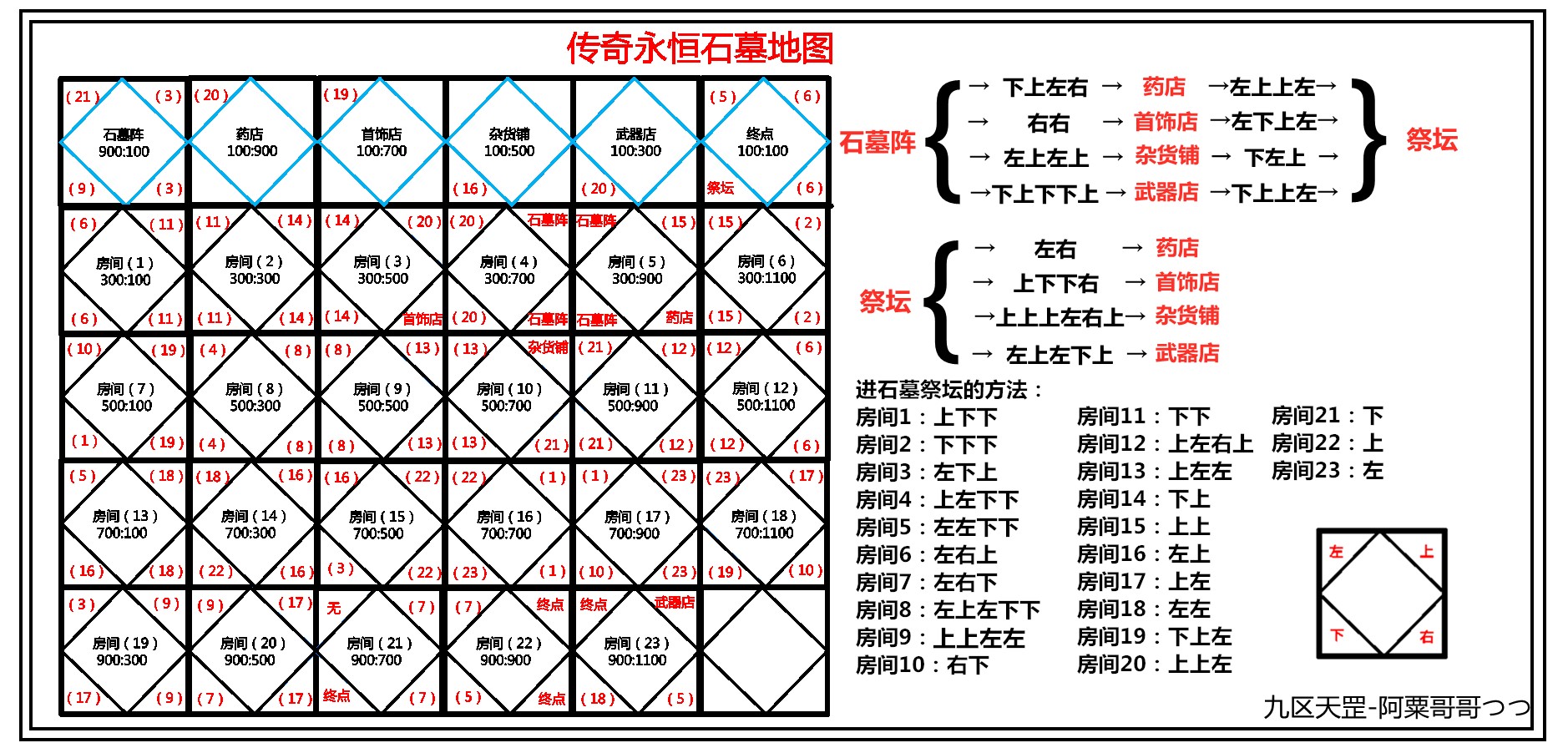 如果人实在太多,也可以去石墓阵里面刷怪,“石墓阵地图”使用方法:如果在石墓阵迷路,先查看右上角地图的当前坐标,找出石墓阵地图上面与之“石墓阵地图”左边对应的房间号,再查看“石墓阵地图”右边就可以去祭坛或其他地方,里面有药店、杂货铺和武器店等,可以补给药水或维修装备等,增加练级续航时间,省去跑图的劳累。别忘了提前去找NPC“老兵”坐标(614,485)购买双倍经验用于升级。