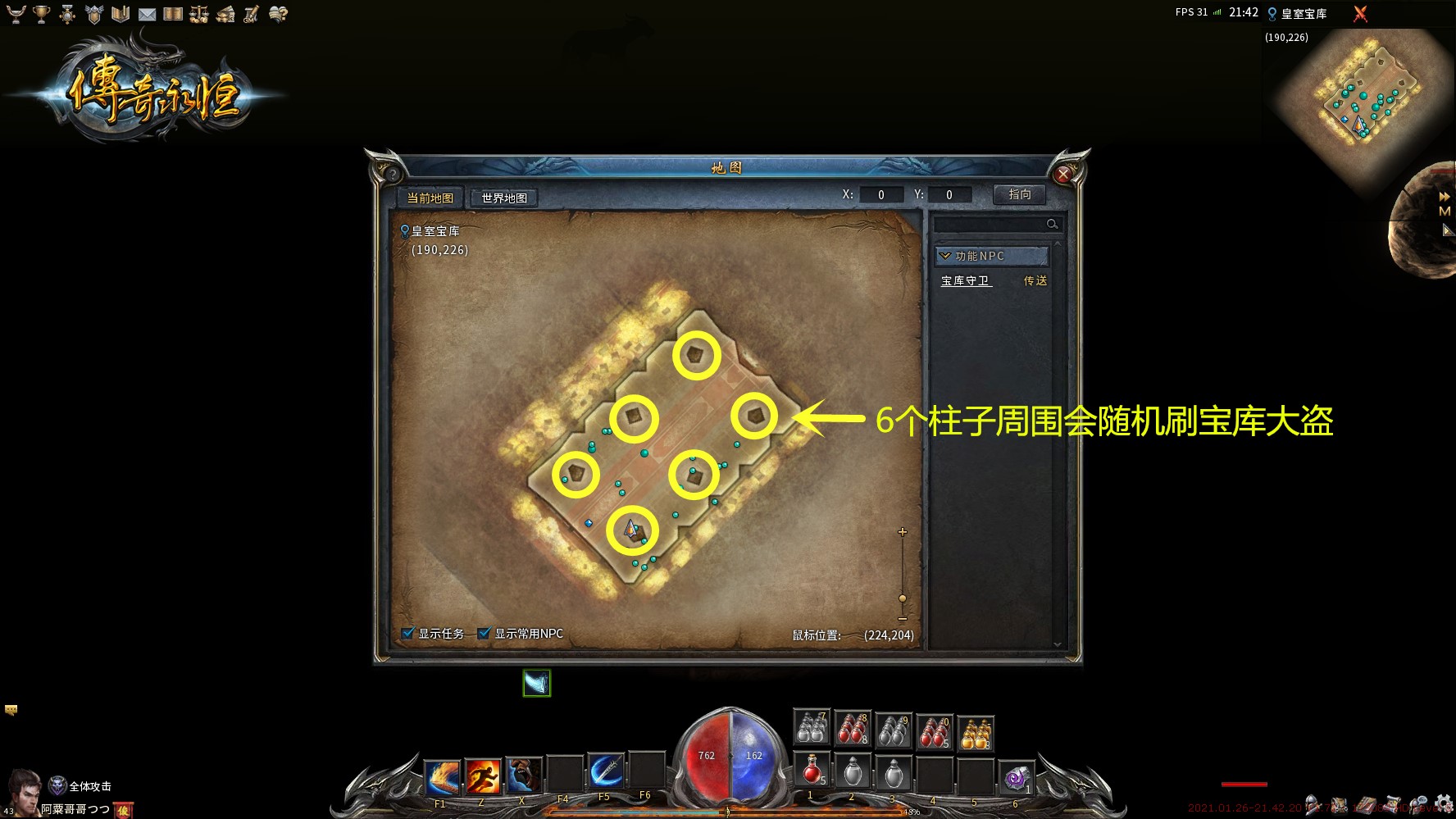 如果是周二、四、六的话,我们便可以参加21点的“皇室宝库”,找NPC“讲古老人”(盟重400,559;比奇636,488),门票需要2万金币,在里面也可以随意PK,不会增加PK值,装备也不会爆出,击杀30级以上的玩家有金币奖励。每过5分20秒会随机刷一定数量的“宝库大盗”,一个大盗大约掉落4.5万的金币,每过15分钟刷1只“贪婪魔王”,随机掉落一定数量的“皇室宝箱”,宝箱有机率开出沃玛件、祝福油级一、二级护肩、鞋,宝箱是无主状态,需要满2分钟以后才能自由捡取。