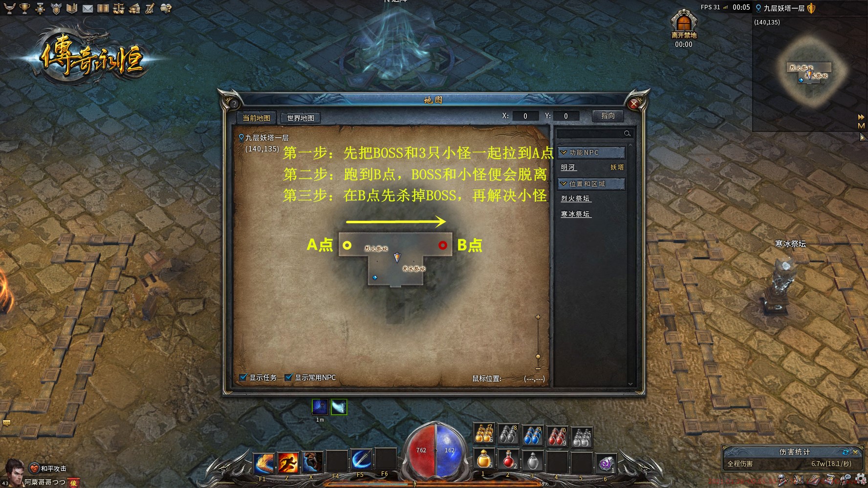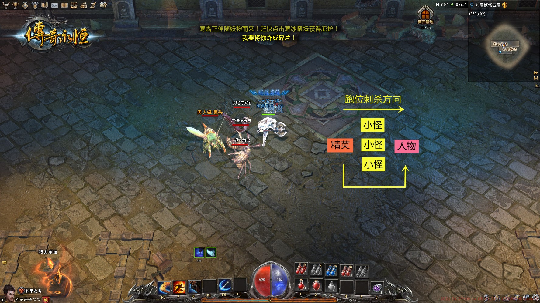 当然如果你对等级还不满足,还想继续升级,也没有问题,你可以带上你最好的装备准备挑战“九层妖塔”,前期“九层妖塔”的经验及其他奖励也是很可观。我们这里就拿战士举例,战士需要带上自己最高的攻击装备,有条件的可以带上破山印、破法印、幽速印等武器,超级金创药和强效太阳水包各准备一两排,找NPC“雷七道”坐标(盟重400,562;比奇632,492)进入妖塔,左边有一个“烈火祭坛”,右边有一个“寒冰祭坛”,按照提示点击相应的祭坛BUFF,前期装备、等级低,建议全程拉刺杀,先打BOSS再打小怪,如何在跑动刺杀过程中让BOSS待在小怪前面,刺杀剑术的技能应该没有满级加之装备等攻击也不够,所以不必强求,能打几层算几层,我先把如何过第9层的方法发出来,后面装备等上来了再参照此法过9层,打过9层妖塔以后NPC会有一个“挑战妖塔秘境”这个选项,挑战这个秘境就可以直接完成九层妖塔的任务,不需要再从1层开始慢慢打,直接可获得60W经验。