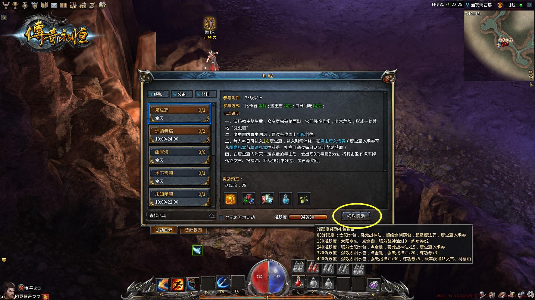 在下魔虫窟副本的时候可以看一下广播有没有公会收玩家的,如果能加入公会就非常棒了。进公会看看公会有没有开温泉、祈祷这些福利,按G→“公会活动”就能看到公会有没有开启活动,在盟重仓库旁找NPC“老沙”(坐标382,485)进入公会属地找NPC“祖巫”(坐标407,509),可以花费五千金币祈祷一次,随机给一定的经验,可以祈祷十次,祈祷一次给5点活跃度,10次一共给50点活跃度。然后找NPC“夏家婶婶”(坐标400,510),可以在相应地图里泡温泉,温泉中会有半个小时的BUFF,根据等级给予相应的增益经验,公会属地、包括温泉这些地方,被其他玩家或宠物击杀有机率掉落装备及其他东西,需要小心。