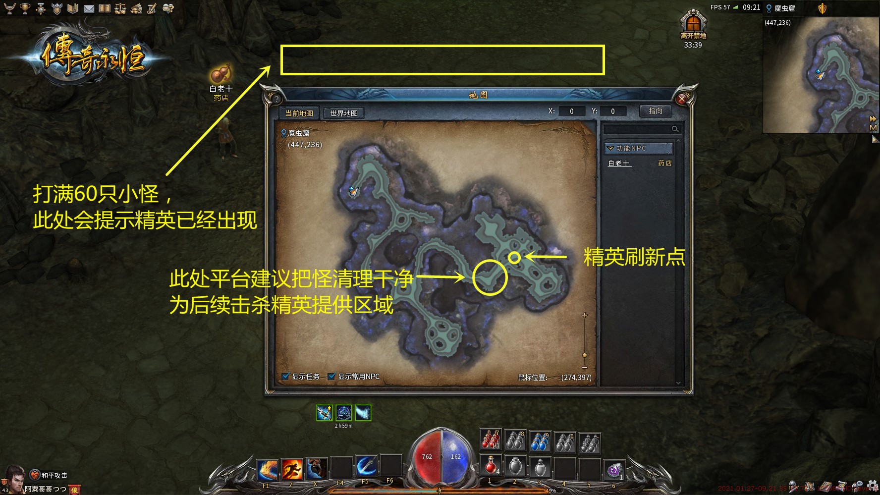一起下魔虫窟副本打宝吧,盟重找NPC“哨探”(坐标340,594),按T组队拍卖模式,尽量用魔卫拉住怪物仇恨,其他职业在非仇恨位攻击怪物,击杀“魔虫窟”副本里面60只怪,会刷出3只精英怪,精英怪的击杀方法与小怪一样,有机率掉落各职业铭文石、祝福油、神圣石碎片、沃玛件、技能书残卷,这里不再赘述。