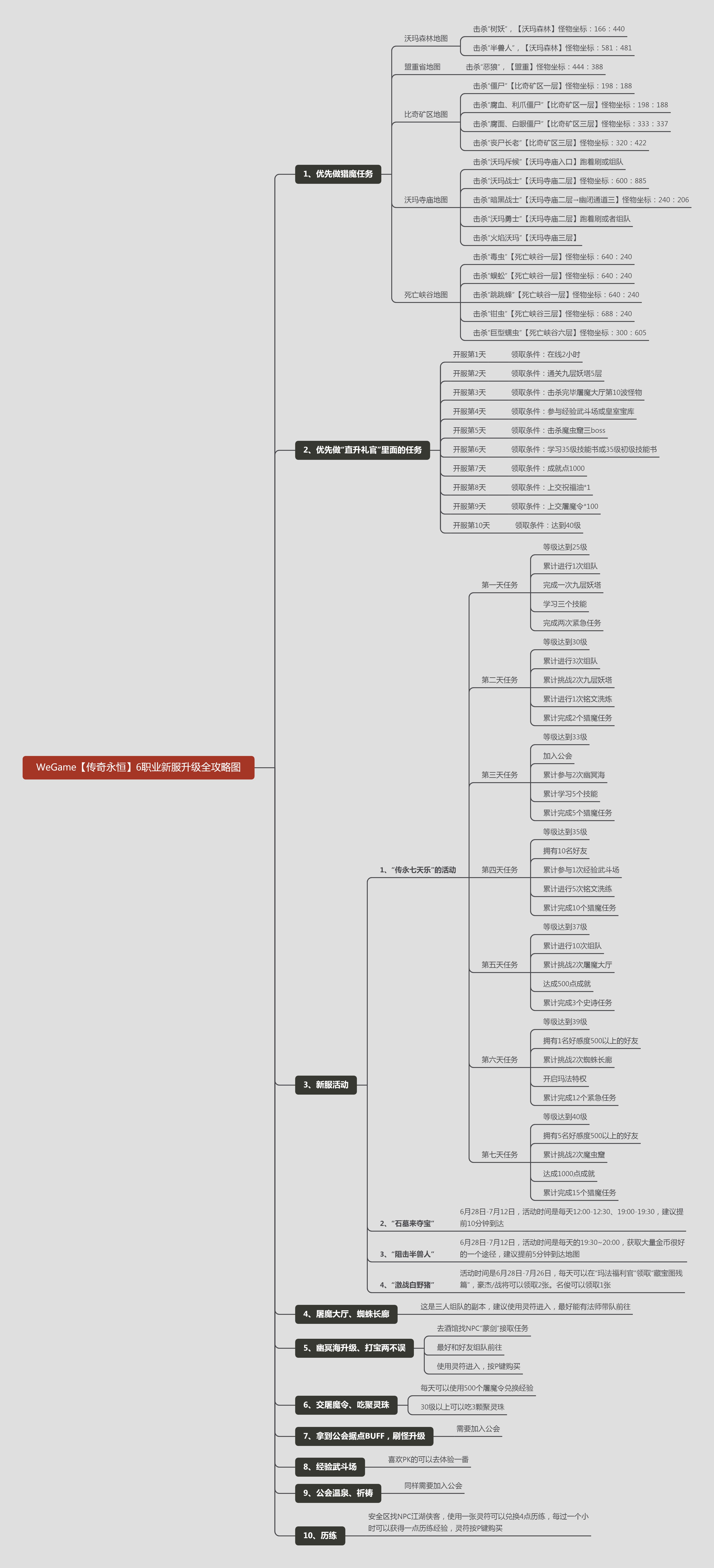 以上便是WeGame【传奇永恒】开服版本六职业玩家的升级轨迹,各位玩家可以根据自己的时间以及队伍,或其他原因调整规划好自己的升级流程图。我们大致的思路就是以猎魔任务为主,如果觉得猎魔任务有些枯燥了,可以继续按照“节日活动”里面提供的任务清单去完成,倘若没有条件完成“节日活动”里面的任务也没关系,我们还可以去“幽冥海”闯一闯,最后让我们再简单梳理一下升级流程: