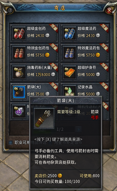 3)职业专属消耗品:施毒药粉(大量)、超级护身符,道士背包内没有同类道具时自动购买;箭袋(大),弓手背包内没有同类道具时自动购买;