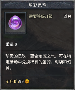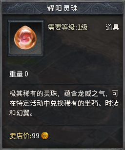 注:奖池中的灵珠、灵珠碎片、永久时装和坐骑均为不绑定,其他道具均为绑定。10个灵珠碎片可合成1个完整灵珠(右键合成)。
