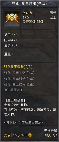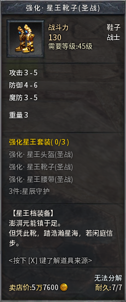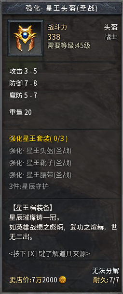 4)同时装备“星王套装”(腰带+鞋子+头盔)可获得套装效果——“星辰守护”:每30秒获得一层星力守护buff,最大可叠加2层;拥有守护时,可降低受到玩家的伤害(详情请见>>)。