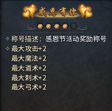 欢度感恩节,活动期间,玩家只需上线即可领取“节日宝匣”1个和“感恩有你”称号(主属性+2)*15天,每人限领1次。