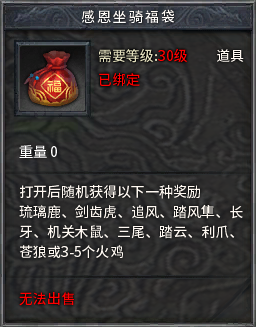 注:“感恩坐骑福袋”为绑定,开出坐骑和火鸡也为绑定;