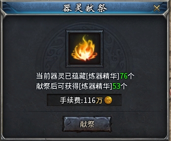 1、提取出来的器灵可进行献祭,获得炼化材料:炼器精华,献祭获得的炼器精华为绑定。