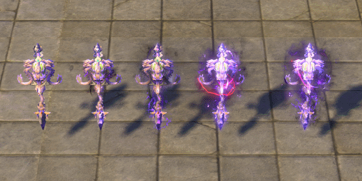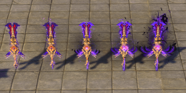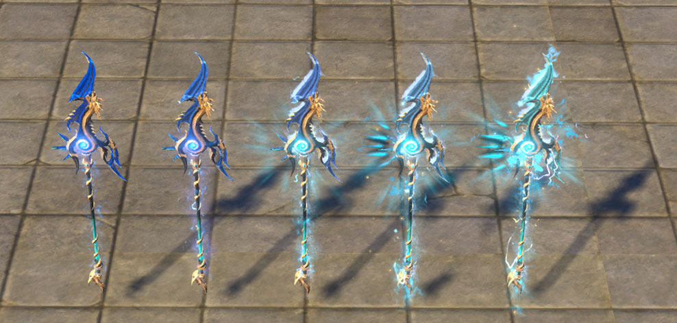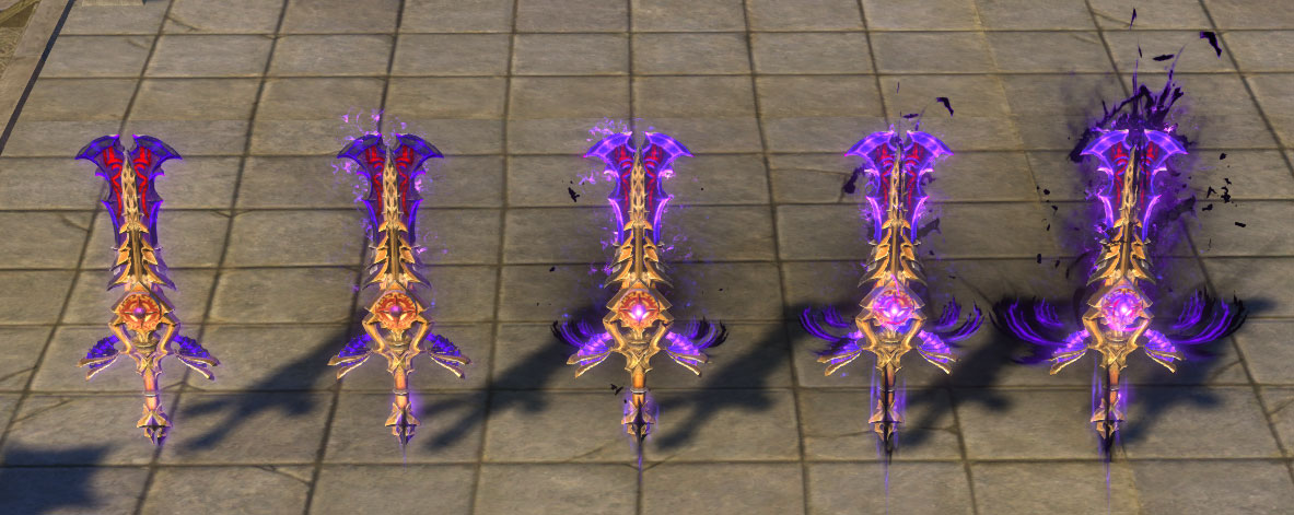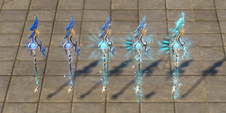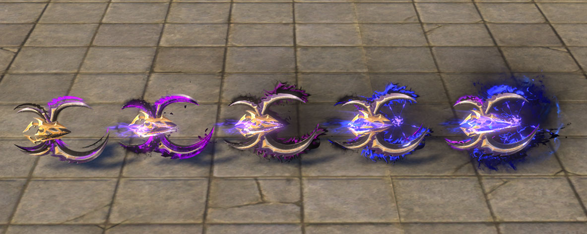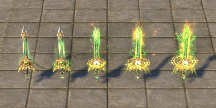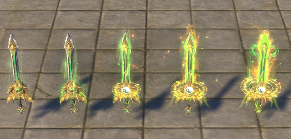 武器之极致,流光星驰,盘龙起凤。游戏中已升级属性之和达到5点的赤月档、魔龙档、苍月档、城主档武器可进行武器铸魂,铸魂成功后该武器所属职业的属性点将会增加1点,最高可将武器主属性之和升级至9点!以下为您带来七职业星王档武器+5、+6、+7、+8、+9动态特效和静态特效鉴赏。