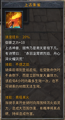 属性加成:下坐骑后,提升自身神圣伤害上限与神圣防御上限各10点,持续20秒。(此效果短时间内不可连续触发)