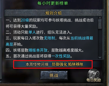 每周一0:00随机当周双属性词缀。词缀:生命、攻击、防御、移速的强化与削弱、陷阱增加/移除、怪物增加/削减,随机双属性词缀仅在20层及以上存在。