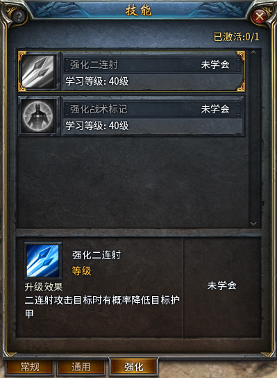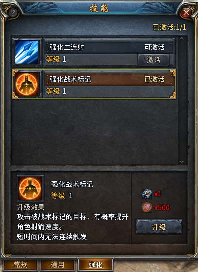 强化技能在学习后需激活方可生效,可在技能面板进行激活操作,仅可同时激活1个强化技能。
