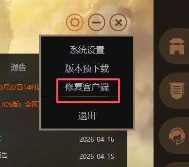 如客户端出现更新失败等异常问题,可以通过上方设置按钮打开【修复客户端】来解决