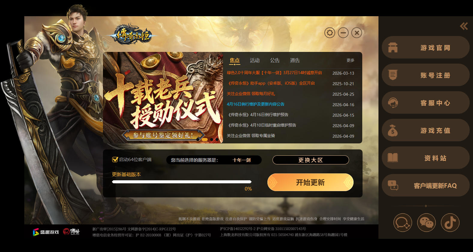 3. 安装完成后,将自动启动《传奇永恒》游戏应用程序,点击“更换大区”选择对应的区服并确认,然后点击【开始更新】或【进入游戏】,待自动更新完成后即可启动游戏。(注:首次更新过程时间较长,请耐心等待!)